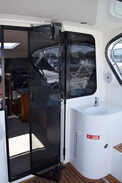 Bi-fold doors and lift up glass allow for full connectivity between the saloon and cockpit. Entertaining is made easy with a new layout of the outdoor chiller-box and a larger centre pod and stern U-shaped leaning post for mounting your BBQ to the new-look transom doors.